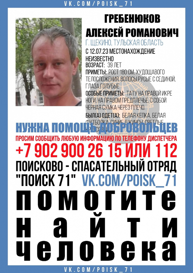 Всех, кто знает о местонахождении Алексея Гребенюкова, просят позвонить диспетчеру поисково-спасательного отряда «Поиск 71» по телефону 8 (902) 900-26-15 или 112.
