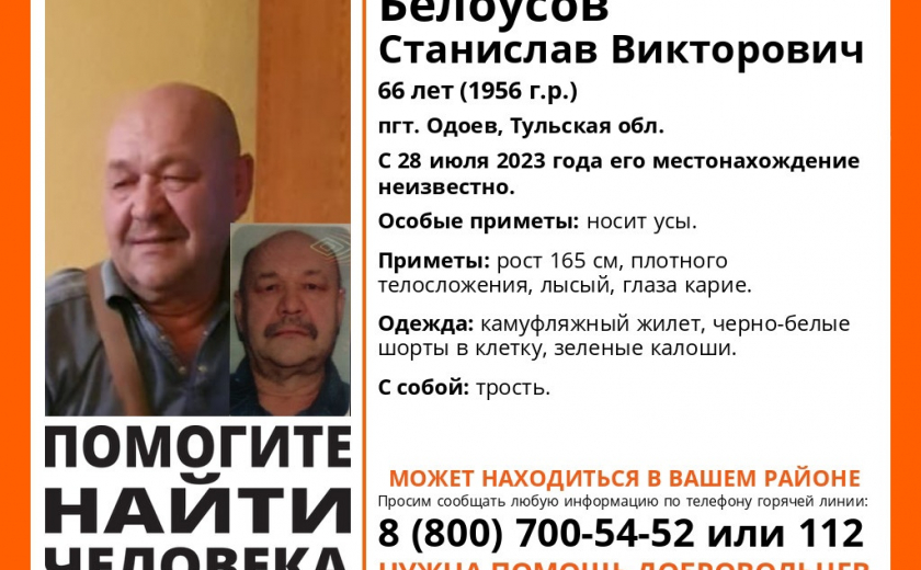Поисковый отряд «ЛизаАлерт» разыскивает 66-летнего Станислава Викторовича Белоусова из Одоева. Местонахождение мужчины неизвестно с 28 июля.
