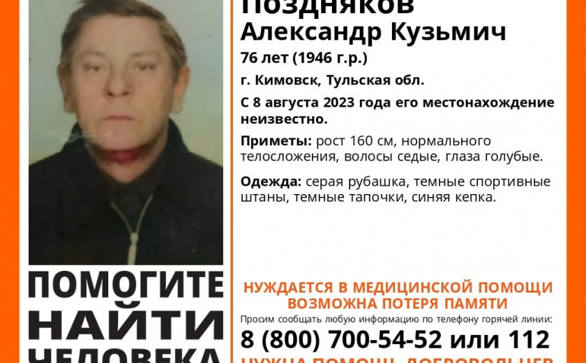 Поисковый отряд «ЛизаАлерт» разыскивает 76-летнего пенсионера из Кимовска. Александр Кузьмич Позняков пропал 8 августа: на данный момент его местонахождение неизвестно. Пожилой мужчина нуждается в медицинской помощи, также у него возможна потеря памяти.