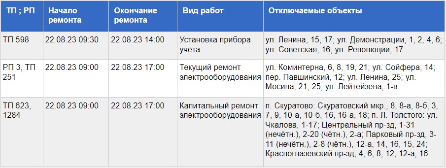 Во вторник, 22 августа, дома на нескольких улицах Тулы останутся без света. График отключений опубликован на сайте «ТГЭС». Специалисты будут проводить плановые работы. В том числе, ремонтировать оборудование и устанавливать счетчики.