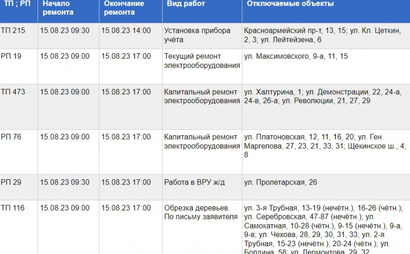 Отключения будут связаны с установкой приборов учета, ремонтом электрооборудования, обрезкой деревьев и другими работами. Жителям стоит ждать их с 09:00, 09:30 или 12:00 до 11:30, 14:00 или 17:00 в зависимости от адреса.