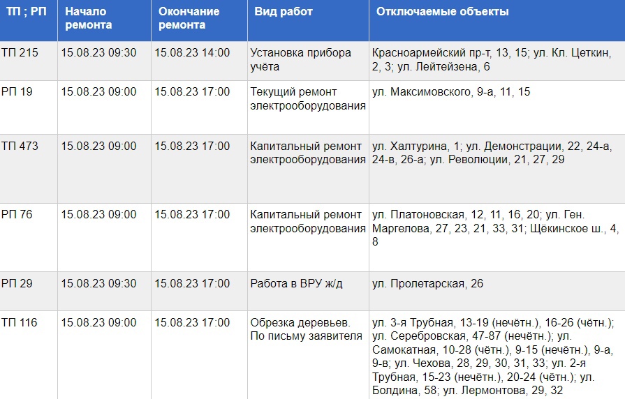 Отключения будут связаны с установкой приборов учета, ремонтом электрооборудования, обрезкой деревьев и другими работами. Жителям стоит ждать их с 09:00, 09:30 или 12:00 до 11:30, 14:00 или 17:00 в зависимости от адреса.