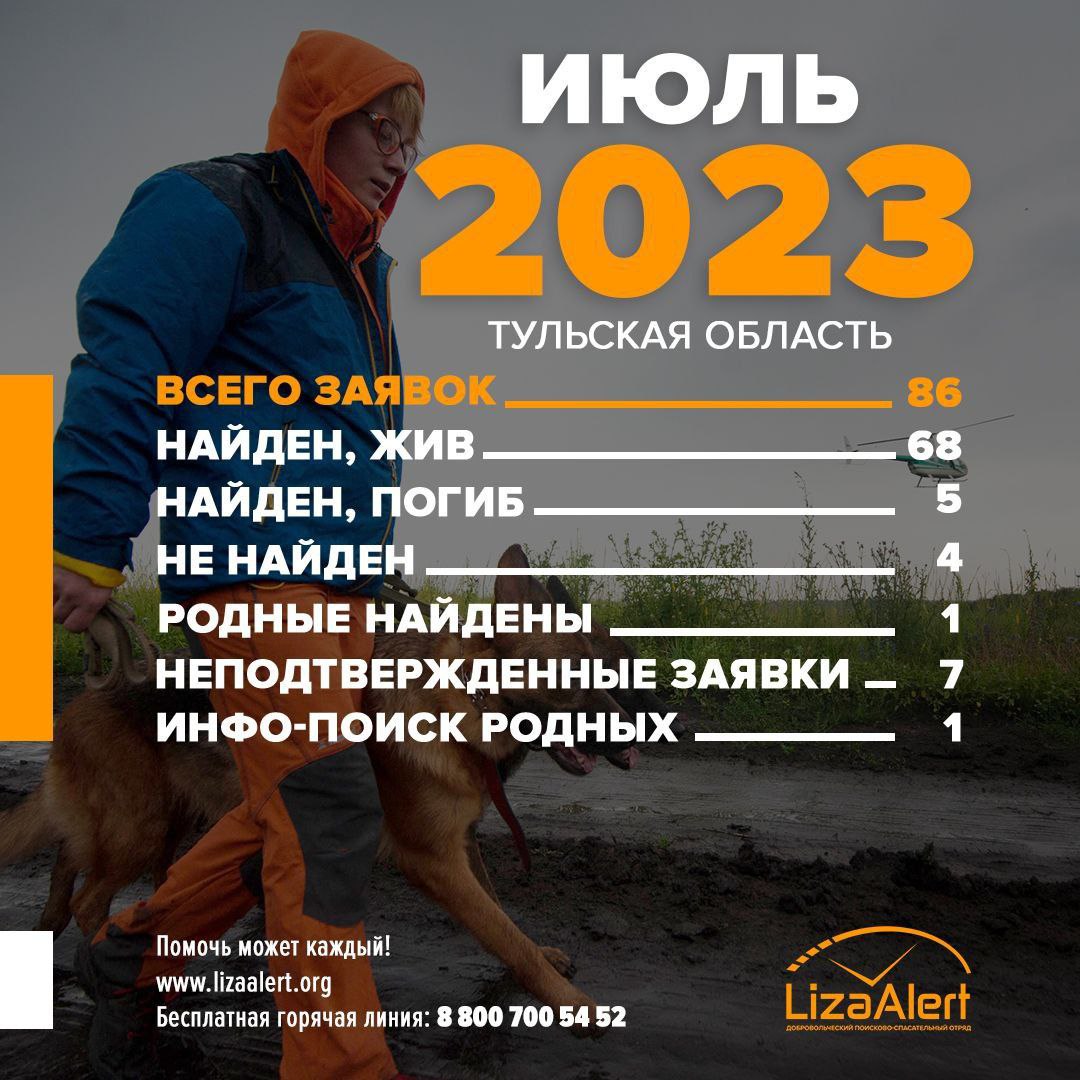 В июле в поисковый отряд «ЛизаАлерт» в Тульской области поступило 86 заявок. По 68 из них исход оказался успешным — пропавших удалось найти живыми. Еще пятеро найдены погибшими.