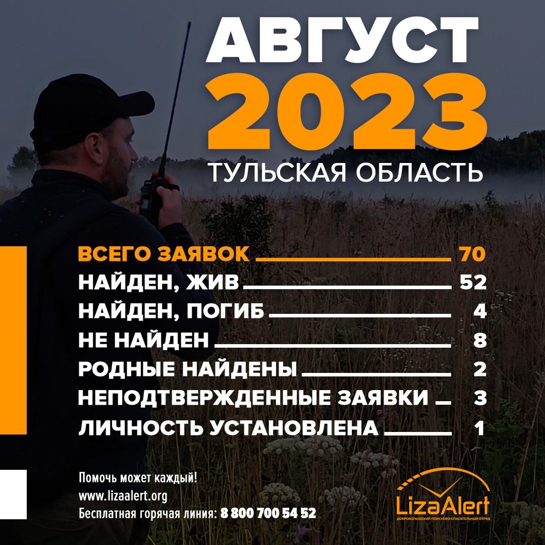 Поисковый отряд «ЛизаАлерт» представил статистику за август 2023 года. Всего тульским поисковикам поступило 70 заявок. 52 человека были найдены живыми. Четверо пропавших обнаружены уже погибшими.