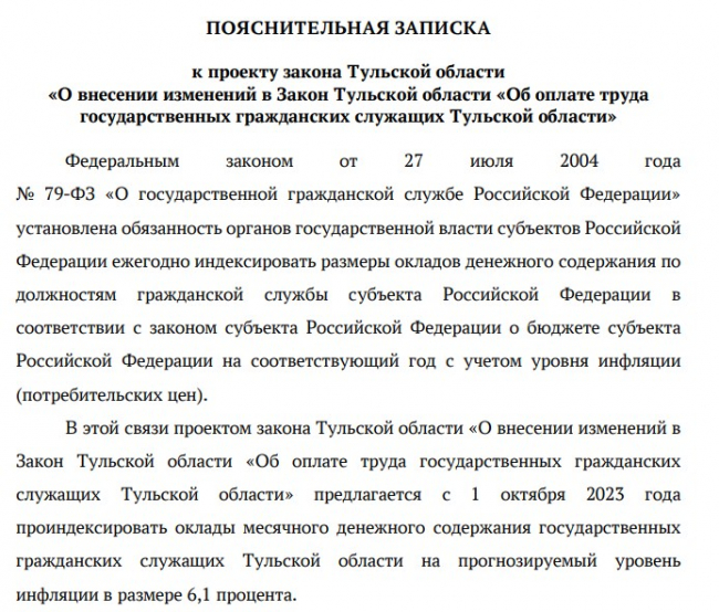 В пояснительной записке к документу говорится, что размеры окладов денежного содержания государственных служащих Тульской области предлагается проиндексировать на прогнозируемый уровень инфляции с 1 октября 2023 года.