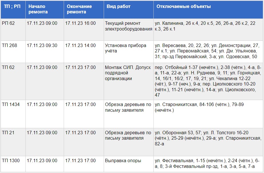 В пятницу, 17 ноября, на нескольких улиц Тулы временно не будет электричества. График отключений опубликован на сайте «ТГЭС». Они связаны с плановыми работами. Специалисты будут проводить текущий ремонт оборудования, установку счетчиков, обрезку деревьев и т.д.