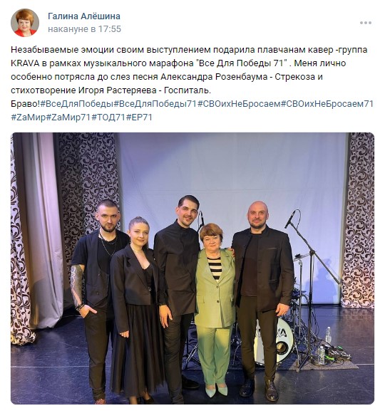 Галина Алешина публикует на своей странице ВК полезную информацию, ключевые новости Тульской области, уделяет большое внимание Плавскому району (отчеты о мероприятиях для жителей, концерты, оказание помощи и прю).