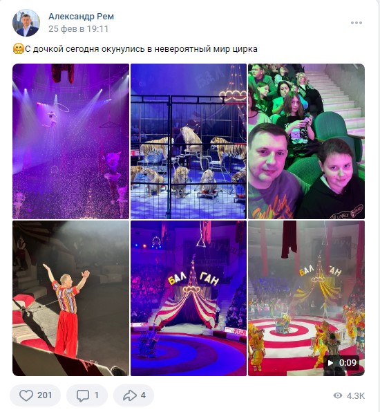 Зампред Тульской областной Думы Александр Рем рассказывает на своей странице не только о важных законодательных инициативах, полезных для жителей инструментах и сервисах, но и делится моментами из личной жизни. Так, простой и теплый пост о походе в Тульский цирк с дочерью собрал больше 200 лайков.