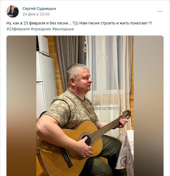 Аккаунт ВК депутата Сергея Судницына модно смело назвать одним из самых «живых» и разнообразных. Политик создает не только информационные посты о работе в Думе и своем территориальном округе, но и делится личным фотографиями из путешествий, походов в кино, на хоккейные матчи и пр. Например, по случаю Дня защитника Отечества депутат поделился снимками из семейного архива, а еще выложил фото с гитарой в руках.