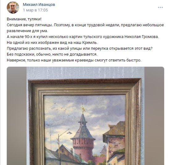 Нешаблонный и живой подход моментально собрал больше сотни комментариев: подписчики рассуждали, спорили, вспоминали карты старой Тулы. Отметим, что Иванцов не просто опубликовал картину-загадку, но и активно участвовал в обсуждении.
