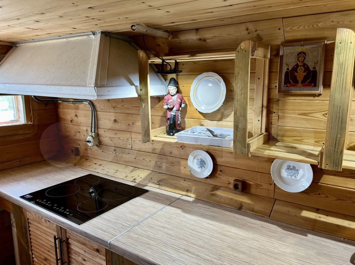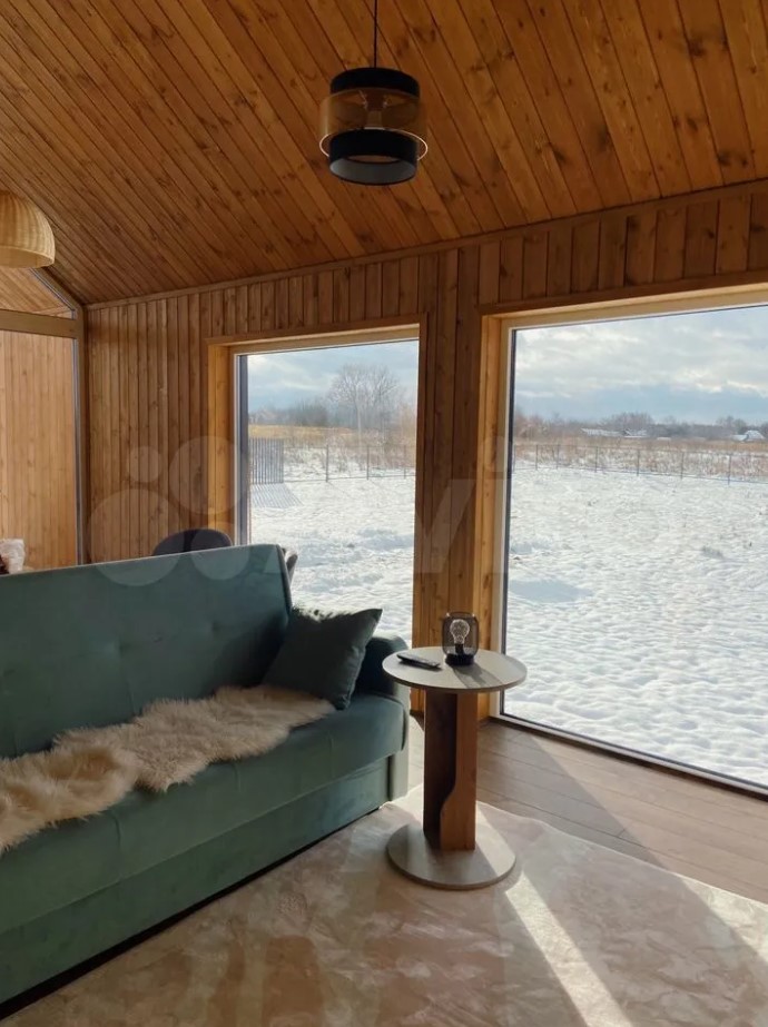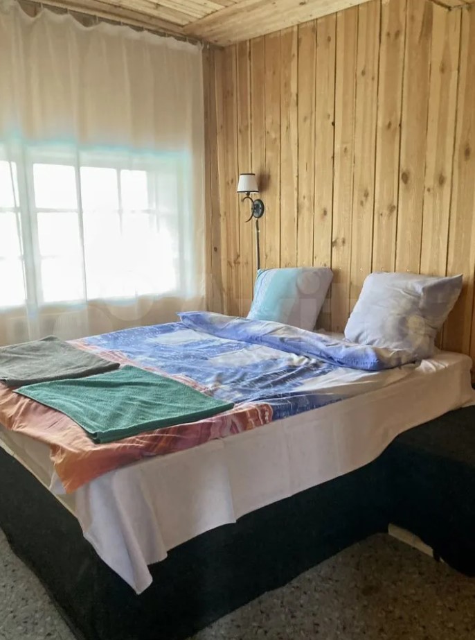 Еще одно предложение из деревни Моховое. Аренда обойдется от 1 500 рублей за человека в сутки. Внутри есть спальня, кухня, душевая. Планировка свободная. Проведены все необходимые коммуникации. Рядом стоит сауна. За нее придется доплачивать.