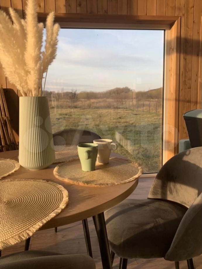 Двухэтажный дом находится в деревне Пушкари Новомосковска. Он расположен на берегу реки Проня, есть свой мостик для купания. Внутри — спальни, гостиная, кухня и ванная комната. Дом рассчитан на восемь спальных мест.
