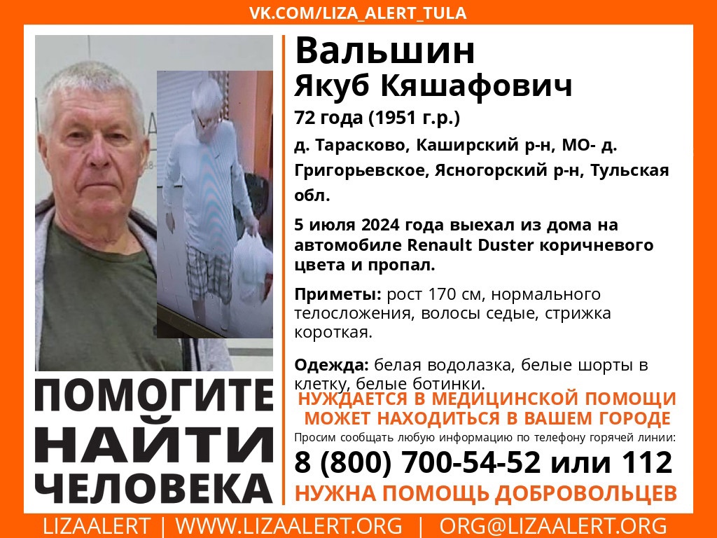 В Тульской области ищут пропавшего пенсионера. По данным отряда «ЛизаАлерт», 72-летний Якуб Вальшин из деревни Григорьевское в Ясногорском районе (также проживает в Каширском районе Подмосковья) выехал из дома 5 июля на коричневом Renault Duster и пропал.