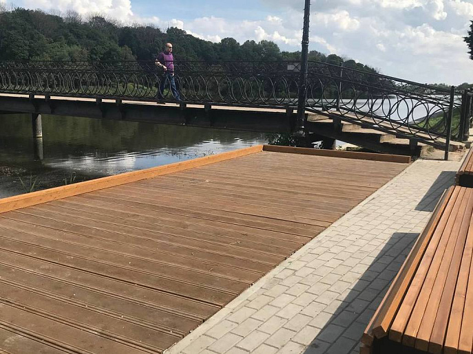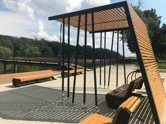 В зоне у воды уже обустроили пирс, выложили тротуарную плитку, установили малые архитектурные формы, лавочки, урны, теневые навесы. Также появится освещение и видеонаблюдение. Все работы планируется завершить до 1 сентября.