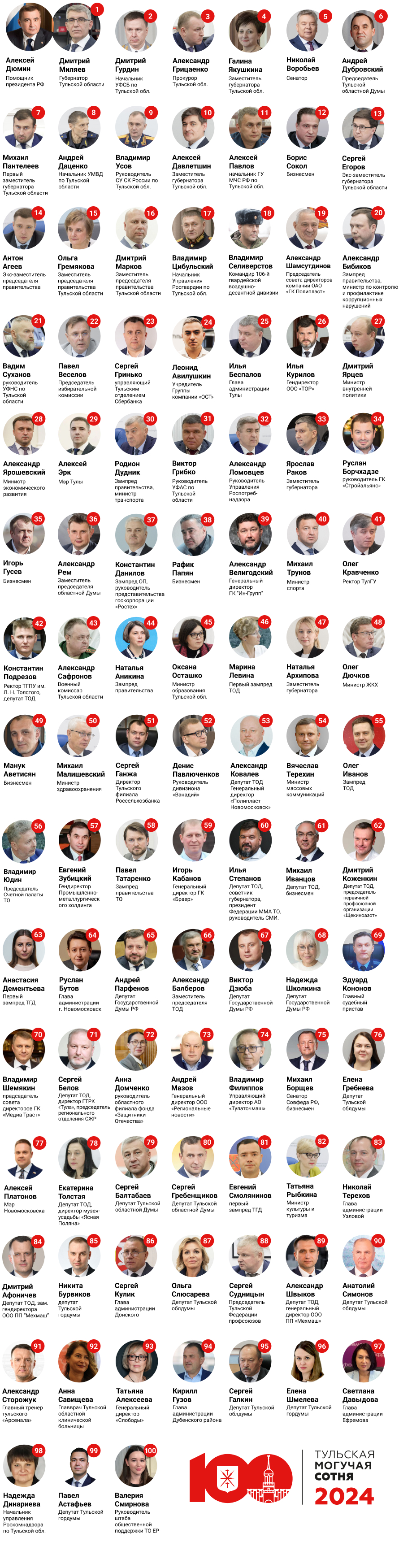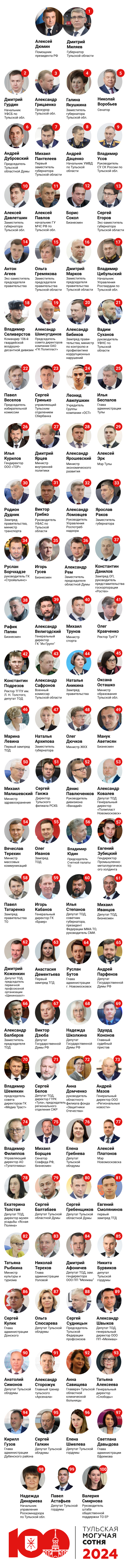 ИА «Тульская пресса» завершило публикацию всех позиций рейтинга «Могучая сотня». Подводим итоги: каким оказался топ-100 2024 года и как он отличается от списка персон прошлого года.