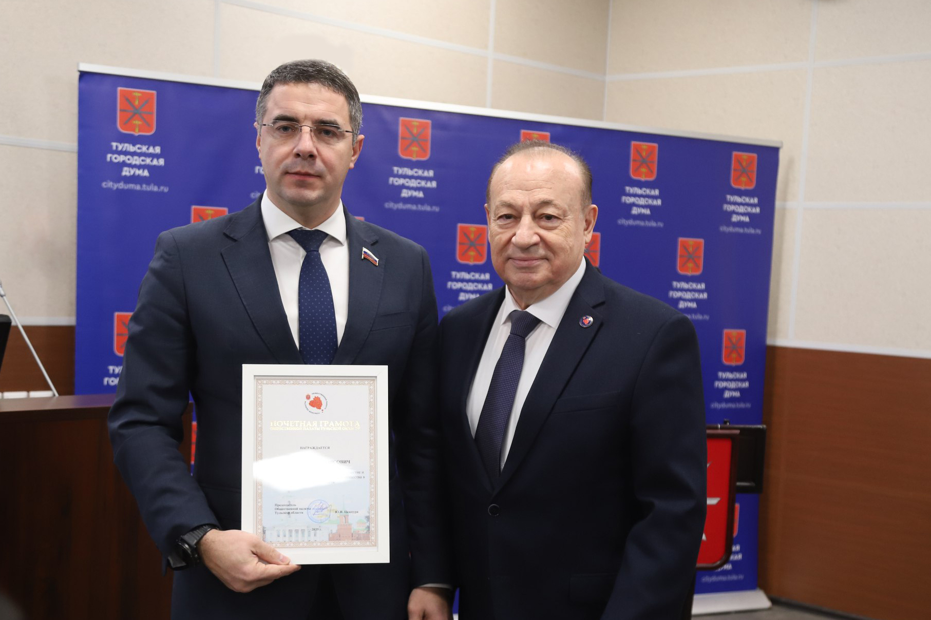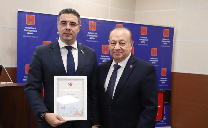 Председатель Общественной палаты вручил награды главе Тулы Алексею Эрку, заместителю председателя Тульской городской Думы Борису Воловатову, депутатам Елене Шмелевой, Олесе Филиной, Елене Симоновой.