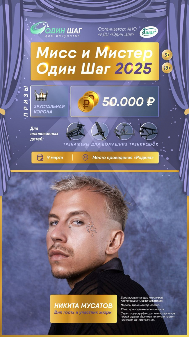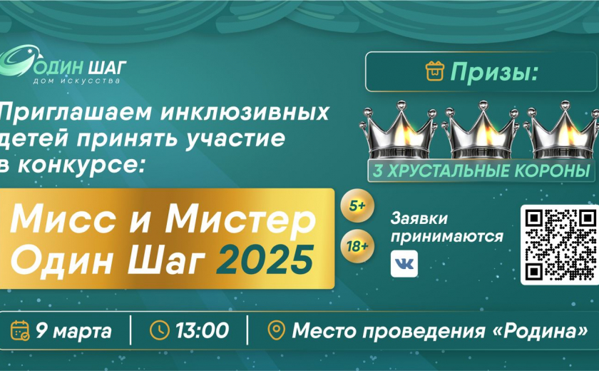 Призовой фонд составляет 50 тысяч рублей. Его разделят между победителями. Главные победители в номинациях «Мисс Один Шаг 2025» и «Мистер Один Шаг 2025» будут награждены хрустальными коронами.