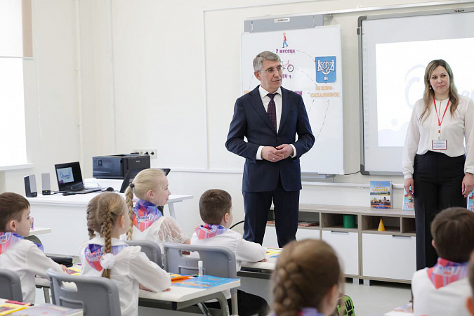 Глава региона осмотрел разные локации в образовательном учреждении. Среди них пищеблок, спортивный зал, кабинеты физики, английского языка и начальных классов, актовый зал и музей.