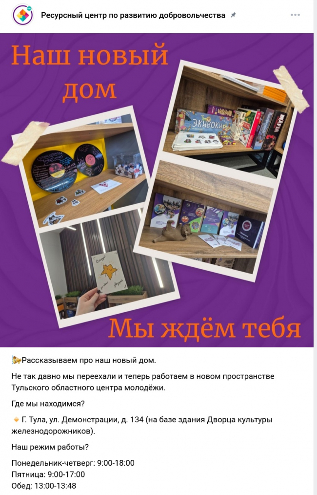 «Когда вы подойдете к зданию Тульского областного центра молодежи, позвоните или напишите сотруднику, чтобы он вас встретил, так как в здании работает пропускная система», — сообщает «Ресурсный центр по развитию добровольчества», который недавно переехал в обновленное здание ДКЖ.
