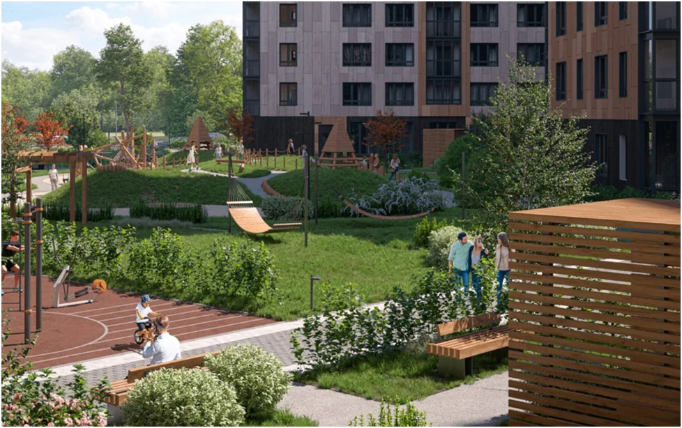 Внутренний двор современного жилого комплекса свободен от машин и изолирован от внешнего трафика. Здесь можно спокойно выпускать детей играть во дворе (для этого предусмотрены собственные детские площадки и парк).