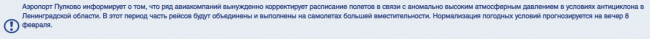 Накануне, 7 февраля, аэропорт Пулково Санкт-Петербурга предупредил, что ряд авиакомпаний вынужден скорректировать расписания полетов. И все из-за высокого атмосферного давления, которое нависло над Ленинградской областью.