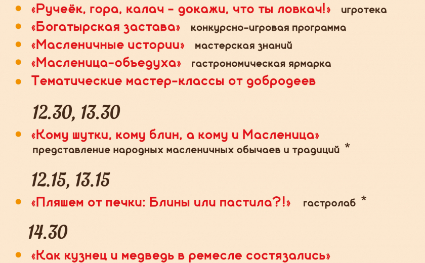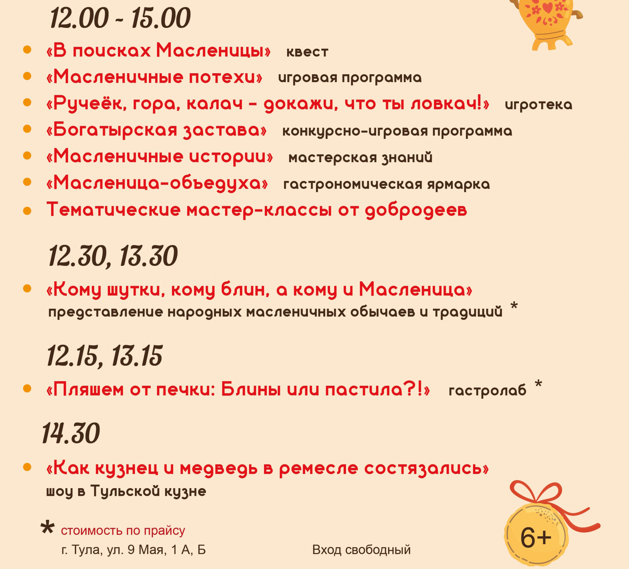 В последний день масленичной недели, 2 марта, ремесленный двор «Добродей» в Туле представит трехчасовую праздничную программу. Гуляния начнутся в 12:00, а завершатся в 15:00. Вход свободный, но на отдельные мероприятия будут пускать по билетам. Подробную информацию приводит медиацентр Объединения центров развития культуры Тульской области.