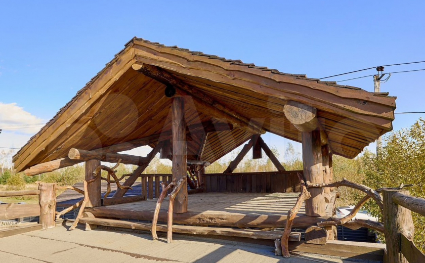 Есть на территории и гостевой дом с гаражом. В нем сложена русская печь с лежанкой и топкой, рядом установлена печь-барбекю с вытяжкой для шашлыков. На участке также установлены вольер для собак, качели, баскетбольная площадка. Есть возможность для игры в мини-гольф. Высажены голубые ели, сибирские кедры и лиственницы. В 150 метрах от дома — озеро с оборудованным спуском в воду.