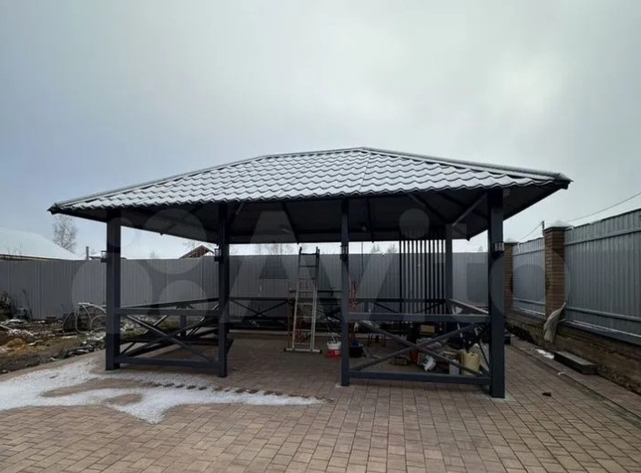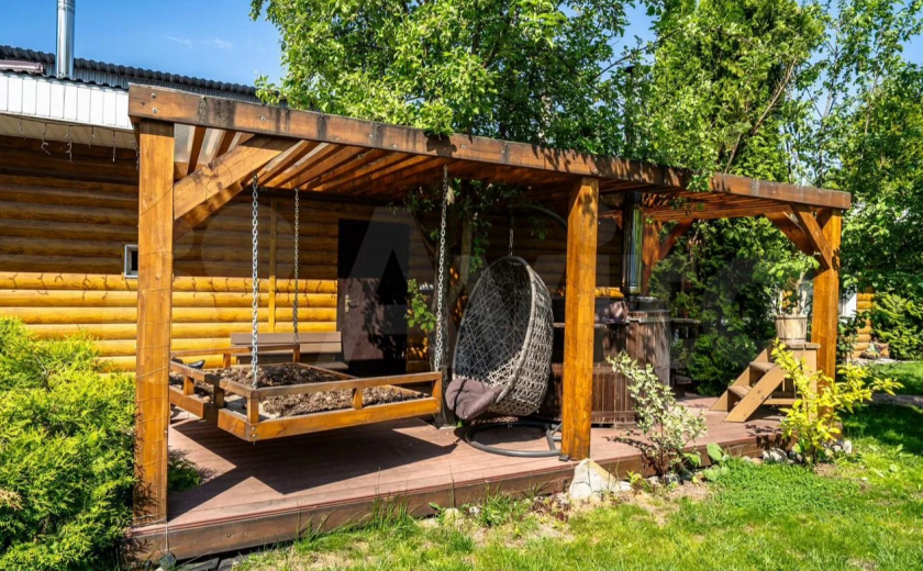 На участке размещены беседка и мангальная зона, площадка под бассейн, баня с верандой, гараж, вольер для собак, курятник, сарай и уличный туалет.