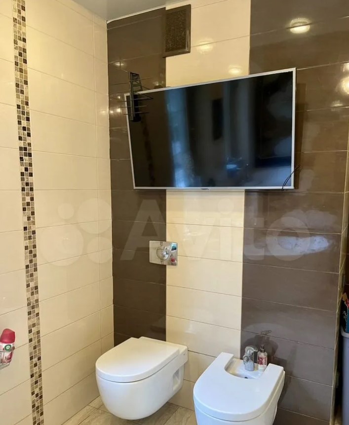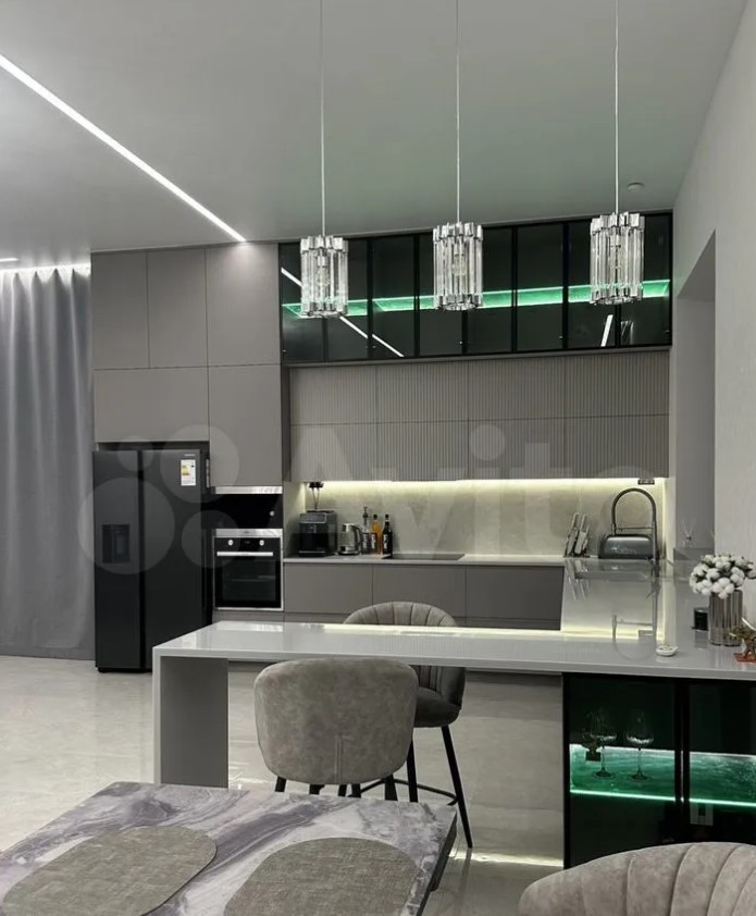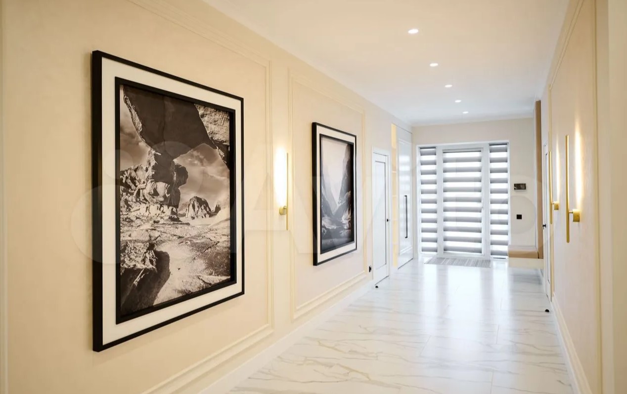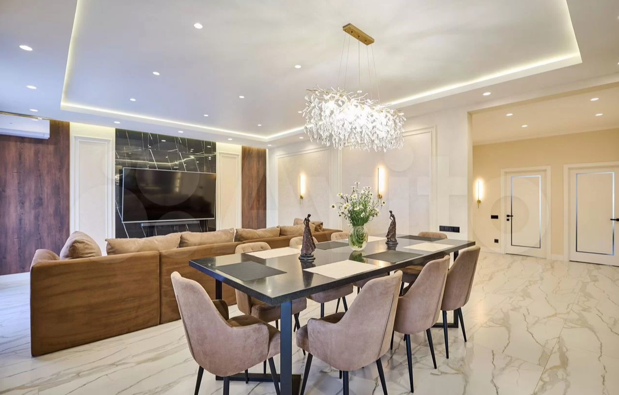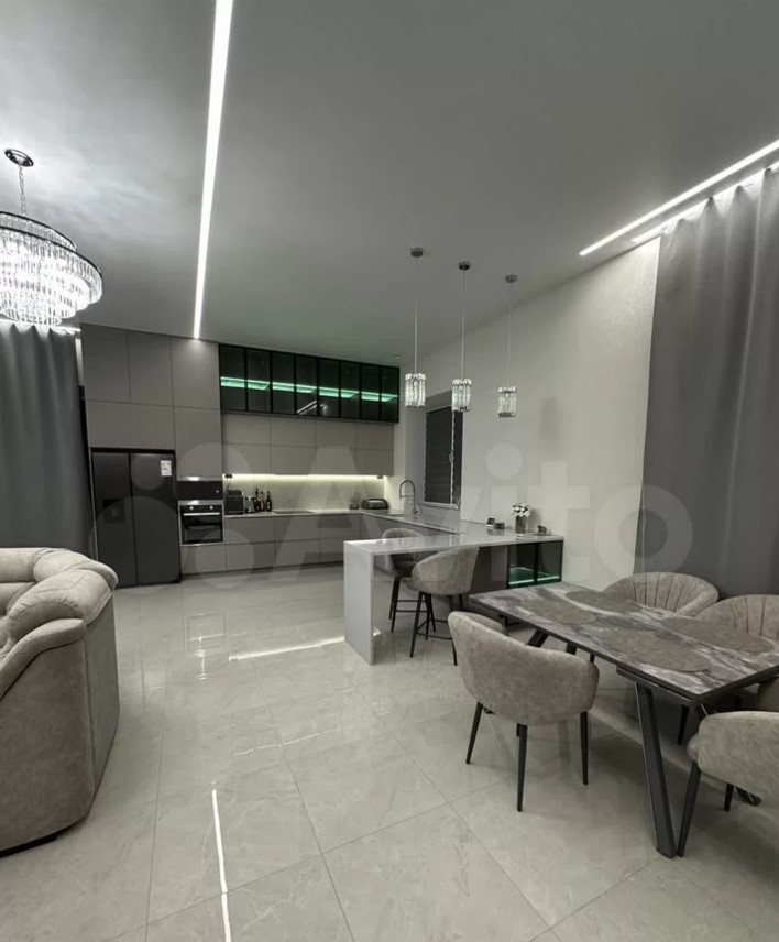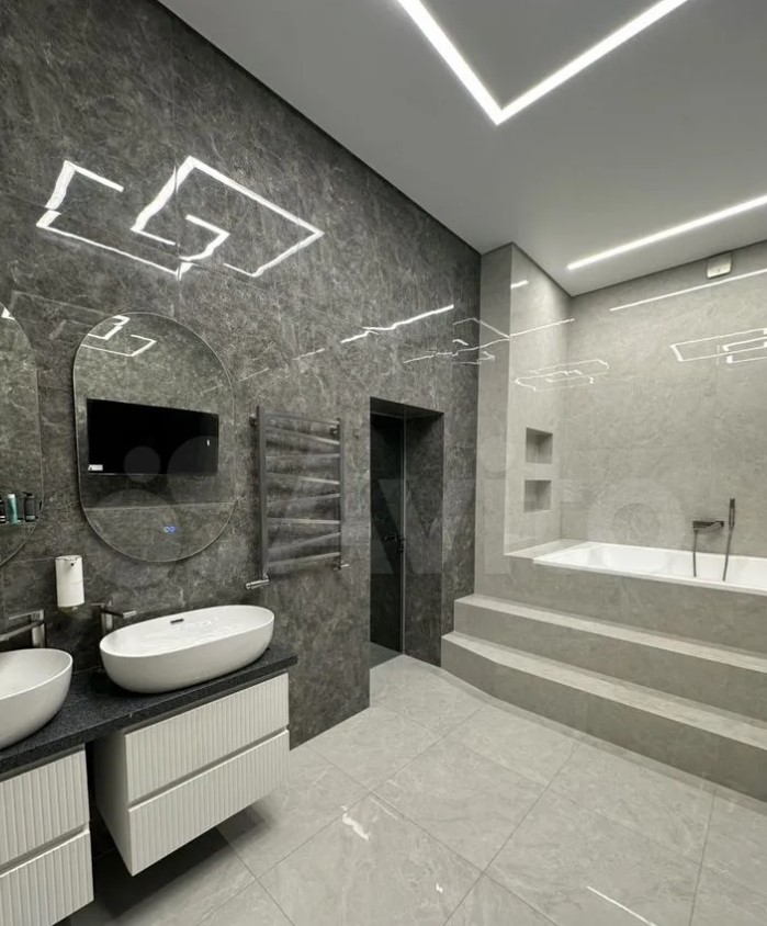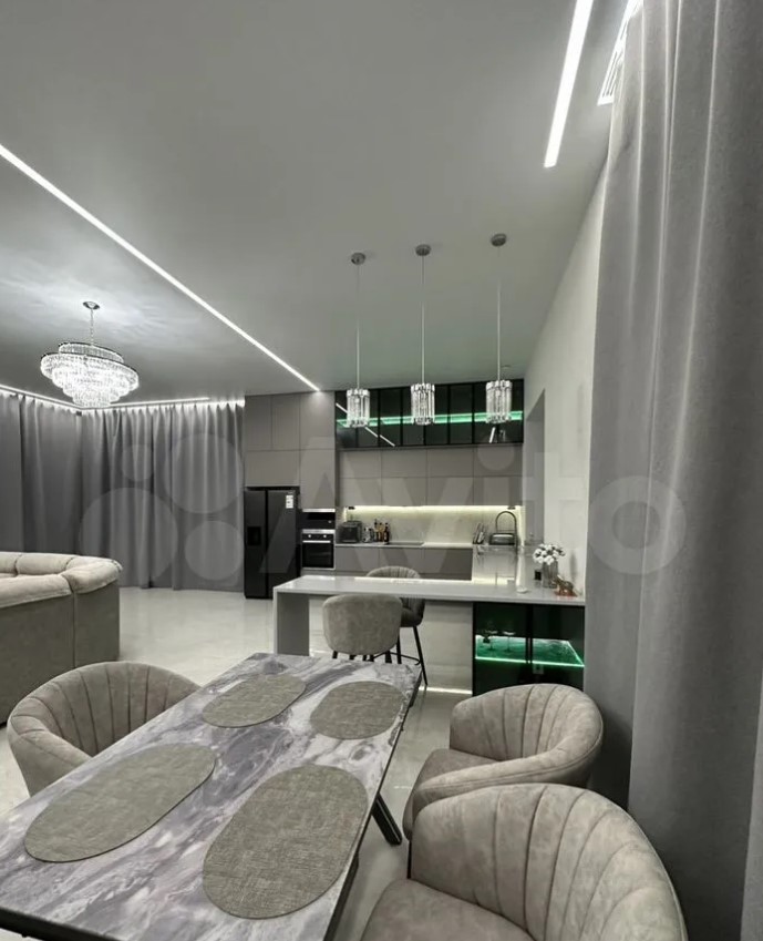 В доме выполнен дизайнерский ремонт. Для отделки использовались гранит, мрамор, дуб. Новому покупателю коттедж достанется со всей мебелью и встроенной техникой.