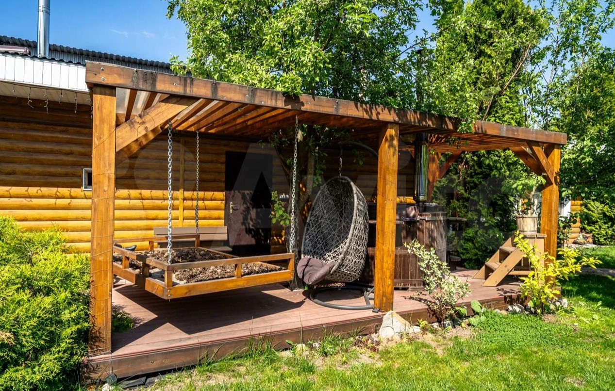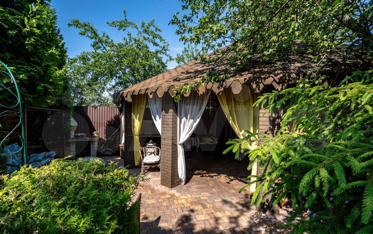 Есть гараж на два машиноместа. Выполнен ландшафтный дизайн с инсталляциями. Новому владельцу останутся все высаженные растения, пруд, детский городок, беседка и шторы для нее, а также вся мебель в бане.