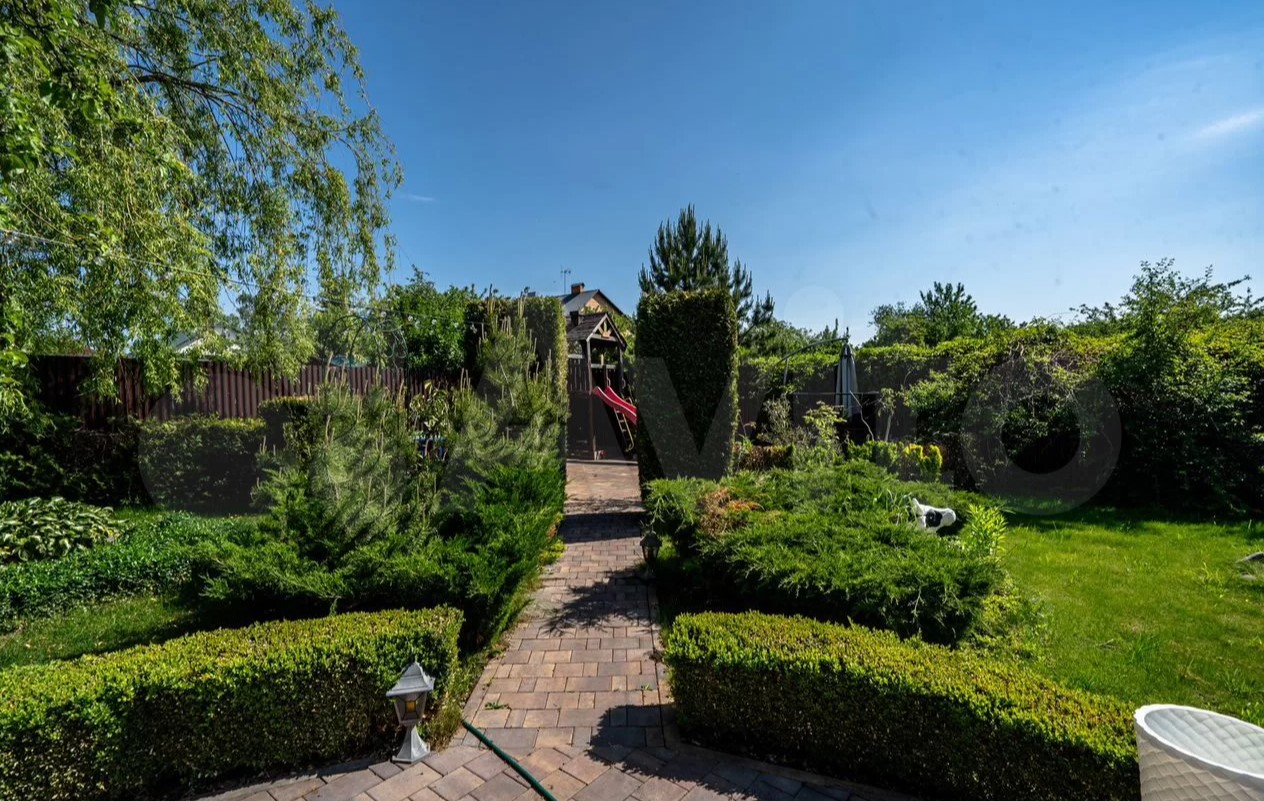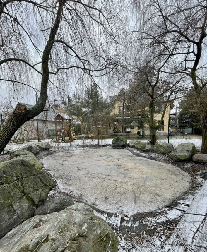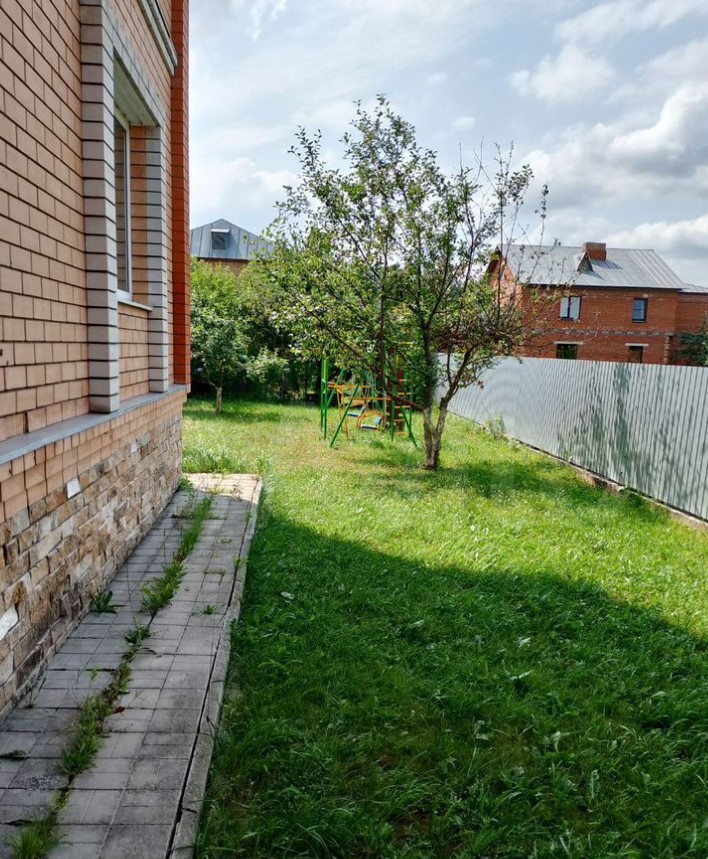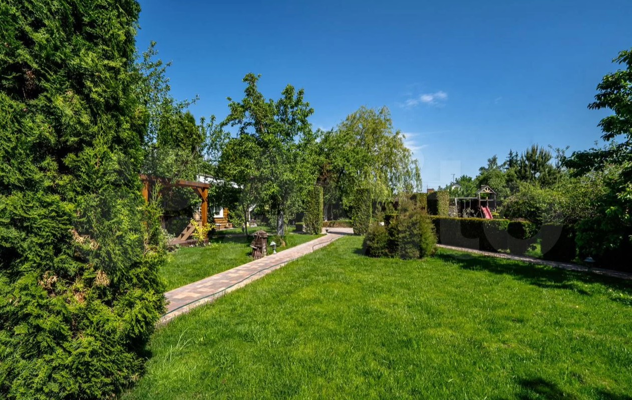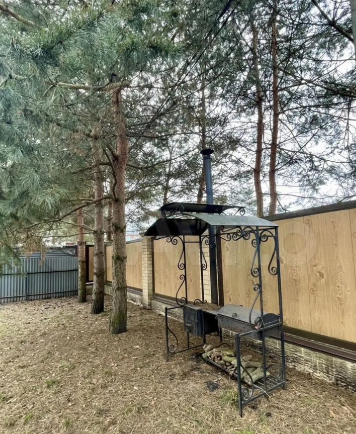 На участке есть зона барбекю, детская площадка, пруд с плакучей ивой, фруктовый сад с яблонями, грушами, смоковницами, грецким орехом, сливами, облепихой, малиной, ежевикой, смородиной, жимолостью и крыжовником. Оборудованы двухэтажный кирпичный гараж на две машины, две теплицы и домик для хозяйства.
