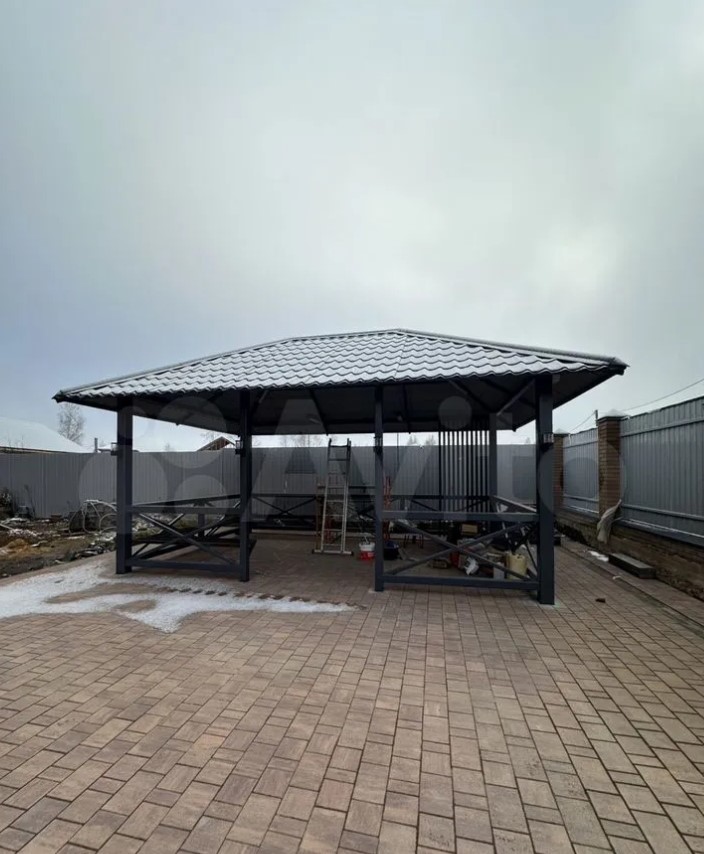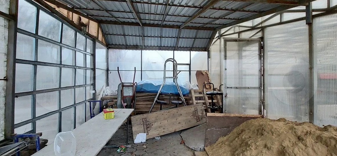 На участке размещены беседка и мангальная зона, площадка под бассейн, баня с верандой, гараж, вольер для собак, курятник, сарай и уличный туалет.