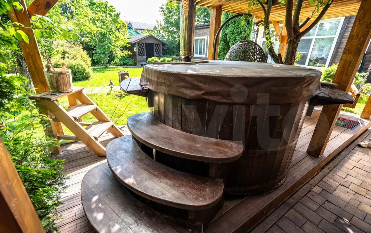 На участке — отапливаемый гараж, теплица, хозпостройка и беседка, сад с плодовыми деревьями, бойлерная, баня с бассейном. В самом доме находятся кухня-студия с панорамными окнами и выходом в сад на первом этаже, пять спален и санузел на втором.