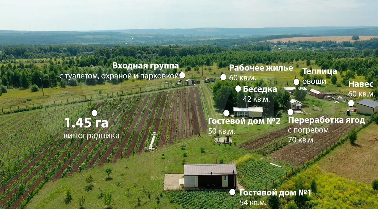 Одноэтажный дом площадью 54 кв. м расположен в Дубенском районе. На территории также расположены гостевой дом, собственный виноградник и домашняя винодельня, беседки, ангар для техники и подсобные помещения для рабочих.