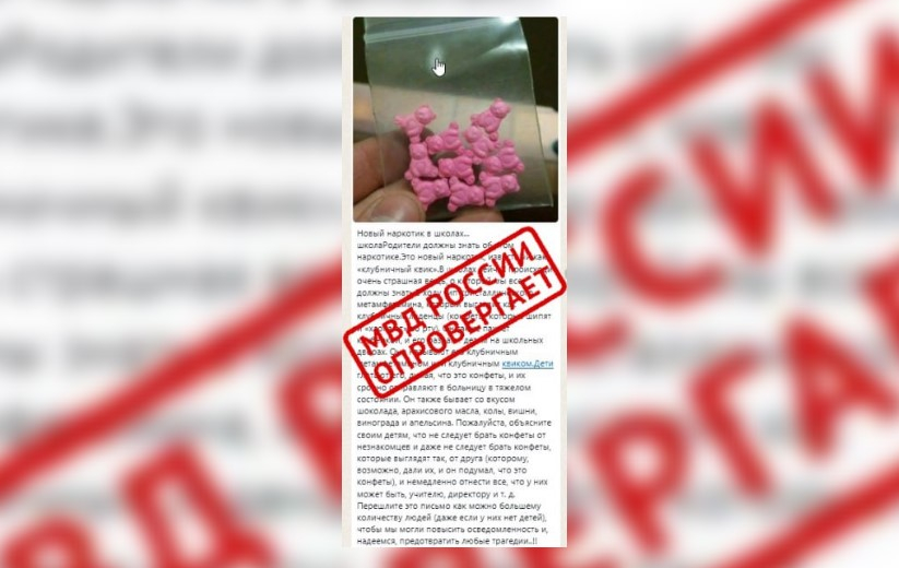 УМВД по Тульской области рассказало о фейке, который пересылают по родительским чатам. В сообщении говорится о распространении в школах нового наркотика «клубничный квик». Сама информация сопровождается фото пакета с конфетами в виде розовых мишек.