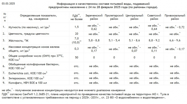 «Тулагорводоканал» привел статистику (с 24 февраля по 28 февраля) качества воды в областной столице. Воду в городе проверяли по шести показателям: содержанию железа, мутности, цветности, общим колиформным бактериям и колифагам, а также жесткости.