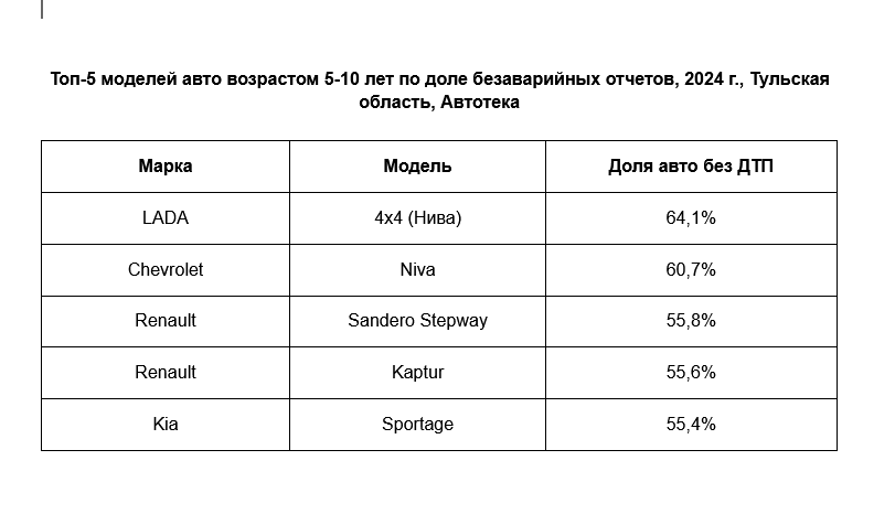 В Тульской области лидером среди безаварийных автомобилей стала LADA 4×4 («Нива»), доля которых составила 64,1%. На втором месте оказалась Chevrolet Niva с 60,7%, а замкнула тройку Renault Sandero Stepway с 55,8%. Также в топ-5 вошли такие модели, как Renault Kaptur (55,6%) и Kia Sportage (55,4%).
