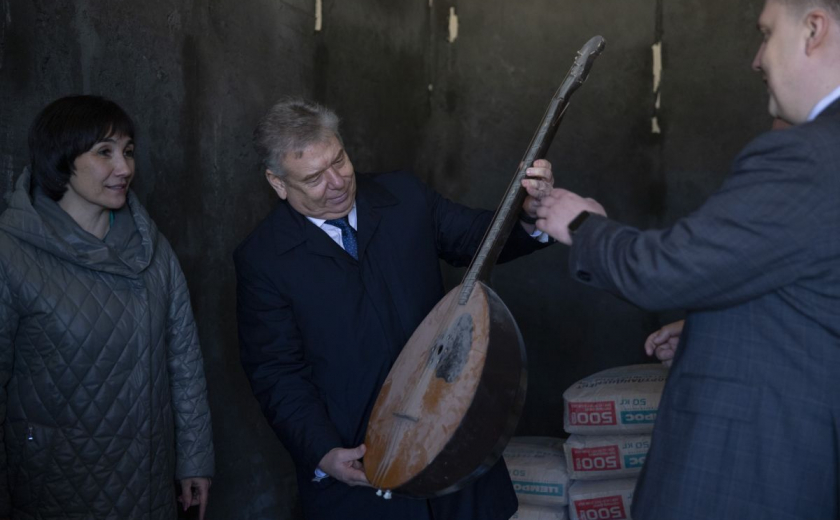 Во время обхода фойе участники встречи обратили внимание на музыкальный инструмент, лежащий среди строительных материалов. Как оказалось, среди рабочих есть молодой человек с музыкальным образованием, который в перерывах играет на домре и поет. Он исполнил песню на своем родном узбекском языке, чем приятно удивил всех собравшихся.