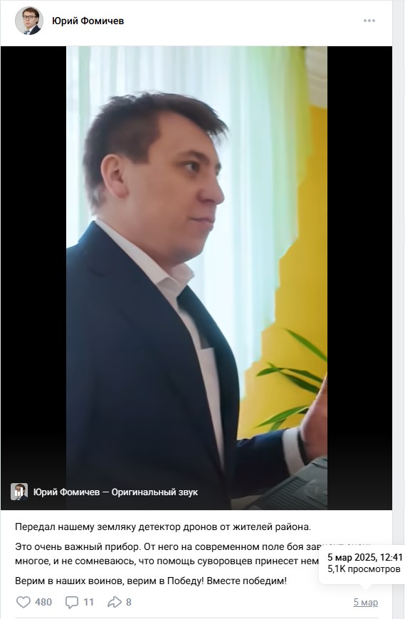 Его самая популярная публикация — о передаче дронов в зону специальной военной операции. Она набрала 5,1 тыс. просмотров, 480 лайков, 11 комментариев и 8 репостов.