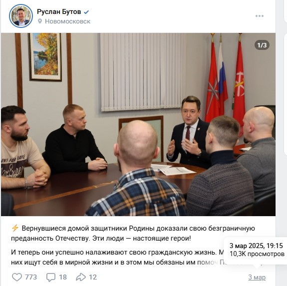 Третье место рейтинга «На волне» занимает глава администрации Новомосковска Руслан Бутов. Просмотров на его публикациях больше, чем у коллег из Тулы и Узловой, но в целом количественные показатели ниже. На комментарии подписчиков он тоже отвечает реже. Самым популярным в отчетную неделю стал пост про встречу Руслана Бутова с военнослужащими — участниками специальной военной операции. Под ним — 10,3 тыс. просмотров, 773 лайка, 18 комментариев и 12 репостов.