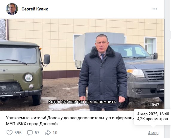 В лидерах также глава администрации Донского Сергей Кулик. Его подход к ведению страницы не изменился: он все так же активно делится рабочими моментами со своей аудиторией, отвечает на комментарии, замечания и предложения пользователей. Наибольшее количество просмотров набрал пост Сергея Кулика про деятельность коммунальных служб — 4,2 тыс. просмотров, а также 595 лайков, 57 комментариев и 10 репостов.