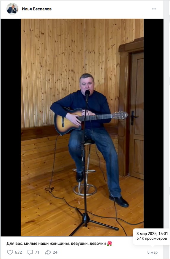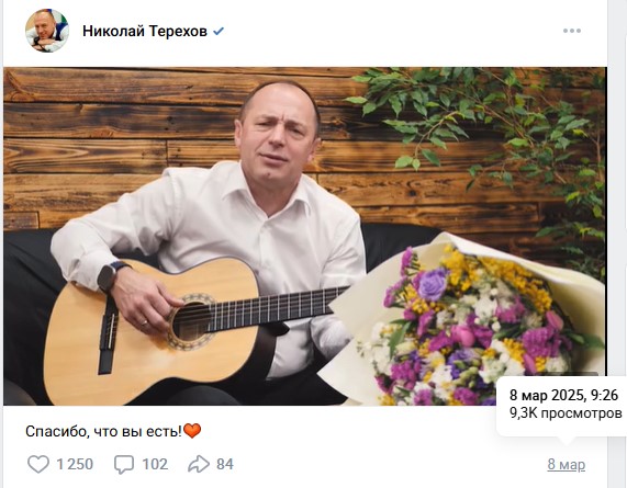 Самый популярный его пост — поздравление под гитару. В отличие от Ильи Беспалова Николай Терехов музыкальным контентом балует не часто, но подписчикам такой формат понравился: публикация набрала 9,3 тыс. просмотров, 1250 лайков, 102 комментария и 84 репоста.