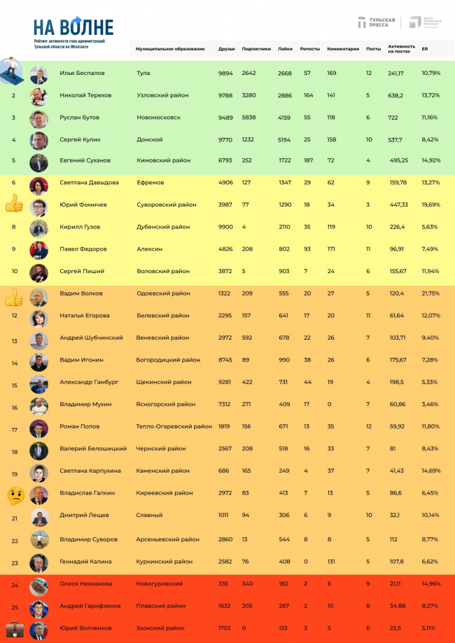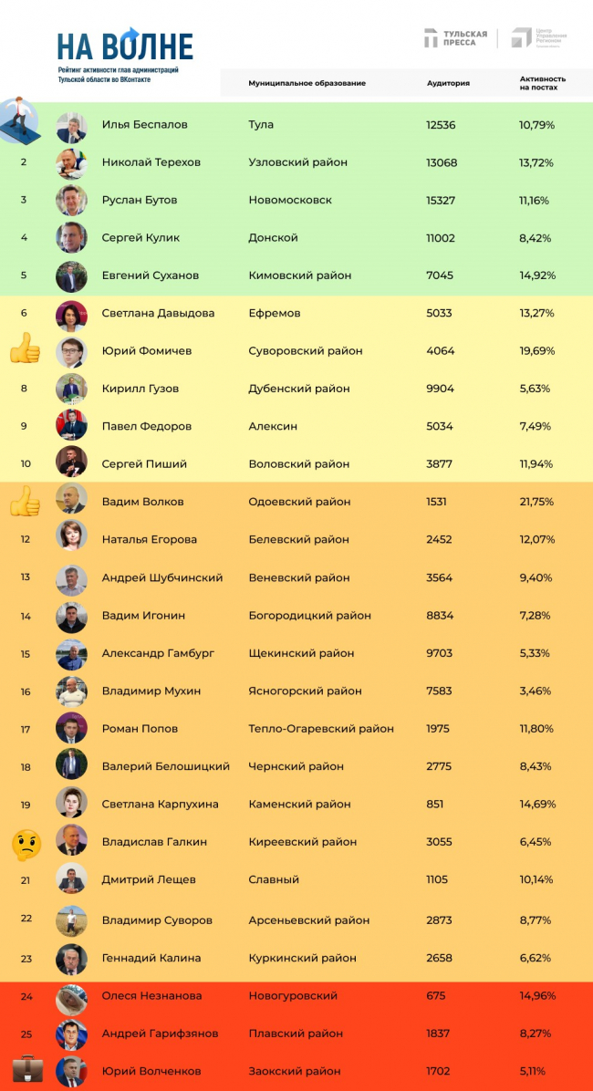 Аутсайдеры рейтинга «На волне» практически не изменились с прошлого года: вернулся в красную зону глава администрации Плавского района Андрей Гарифзянов, а замыкает список глава администрации Заокского района Юрий Волченков. Последний, несмотря на попытки вести свою страницу активно, аудитории мало интересен. Комментариев немного, и даже на них чиновник не отвечает.