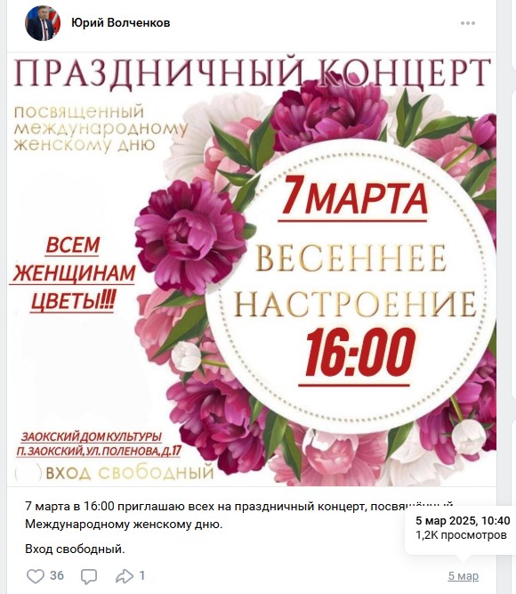 Самый популярный пост Юрия Волченкова — анонс концерта в честь Международного женского дня. Он набрал 1,2 тыс. просмотров, 36 лайков и 1 репост.