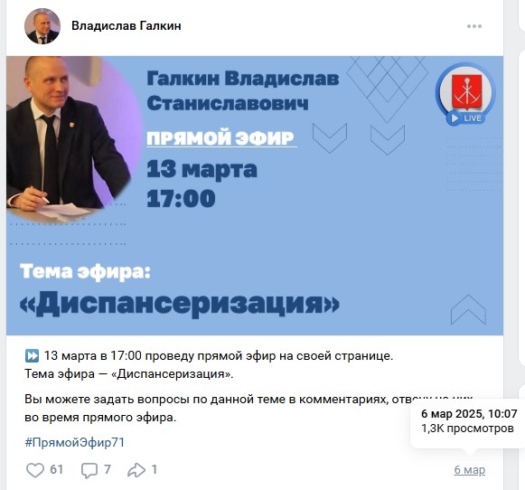 Глава администрации Киреевского района Владислав Галкин опустился в рейтинге еще ниже. Аудитория на его странице стала менее активной, а немногочисленные комментарии чиновник предпочитает игнорировать. Самая популярная его публикация (из пяти) была посвящена предстоящему прямому эфиру на тему диспансеризации. Анонс на странице Владислава Галкина набрал 1,3 тыс. просмотров, 61 лайк, 7 комментариев и 1 репост.
