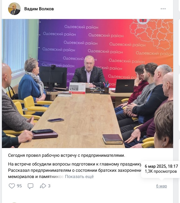 Наиболее популярный пост у Вадима Волкова в отчетную неделю — про встречу с предпринимателями. Он набрал 1,3 тыс. просмотров, 95 лайков и 3 репоста.