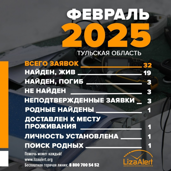 Поисково-спасательный отряд «ЛизаАлерт» за февраль 2025 года получил 32 заявки о пропаже людей. Из них живыми нашли 19 человек.