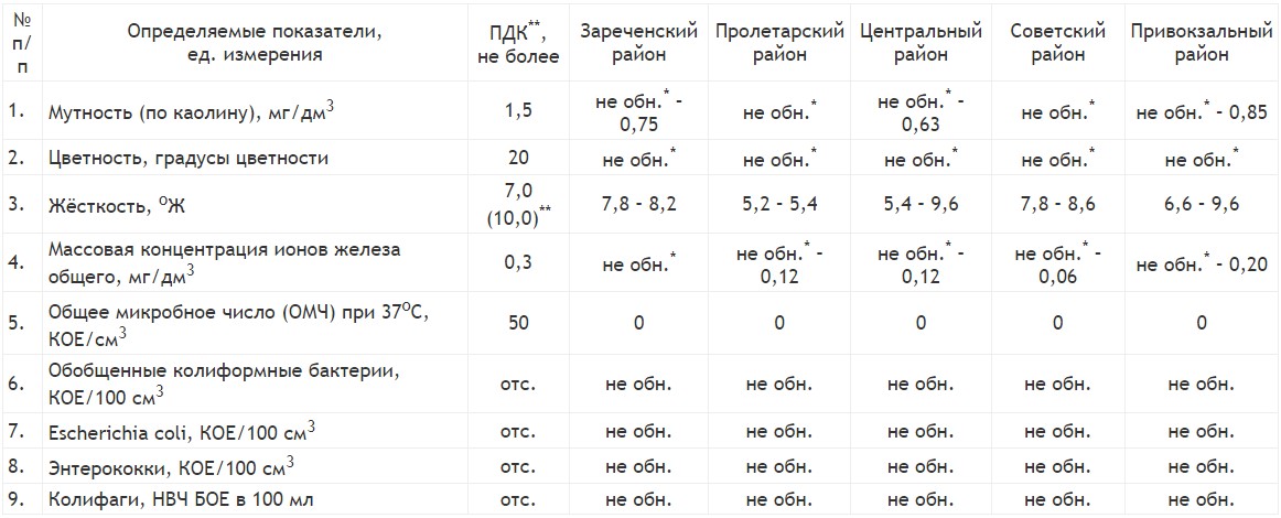 Согласно результатам, мутность воды и содержание железа не превысили установленных норм, исходя из чего вода не имеет видимых загрязнений и соответствует санитарным требованиям по этим показателям. Также не было зафиксировано присутствия бактерий в водоснабжении, что подтверждает высокое качество воды.