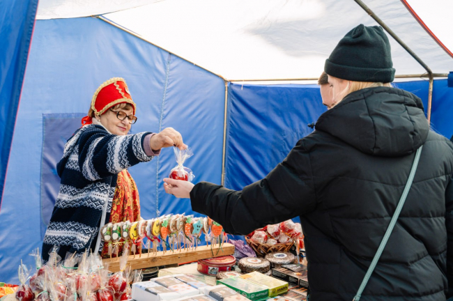 Здесь же работала праздничная ярмарка, на которой свои товары представили региональные производители. Каждый мог попробовать карамельные яблоки, различные чаи, анковский пирог, слоеные пряники, пастилу, купить сувениры. Желающих также угощали чаем из самовара и вафлями.