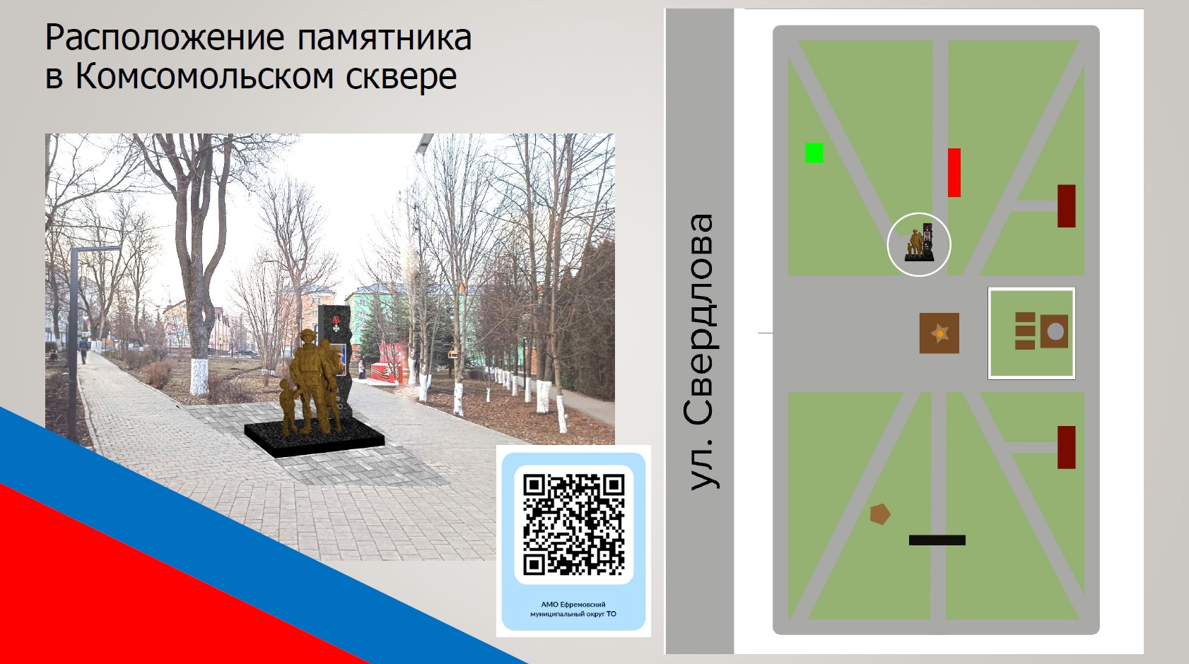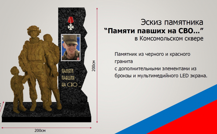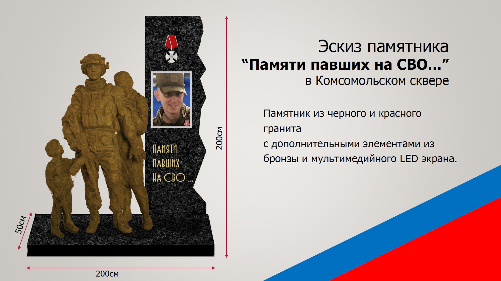 Второй, более масштабный памятник, будет установлен в Комсомольском сквере после окончания СВО. Он будет выполнен из гранита и включать бронзовую скульптуру воина с супругой и ребенком», — рассказала в своих соцсетях глава администрации Светлана Давыдова.